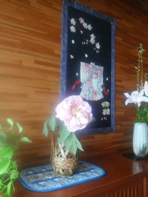 その後ろにパッチワークのタペストリー